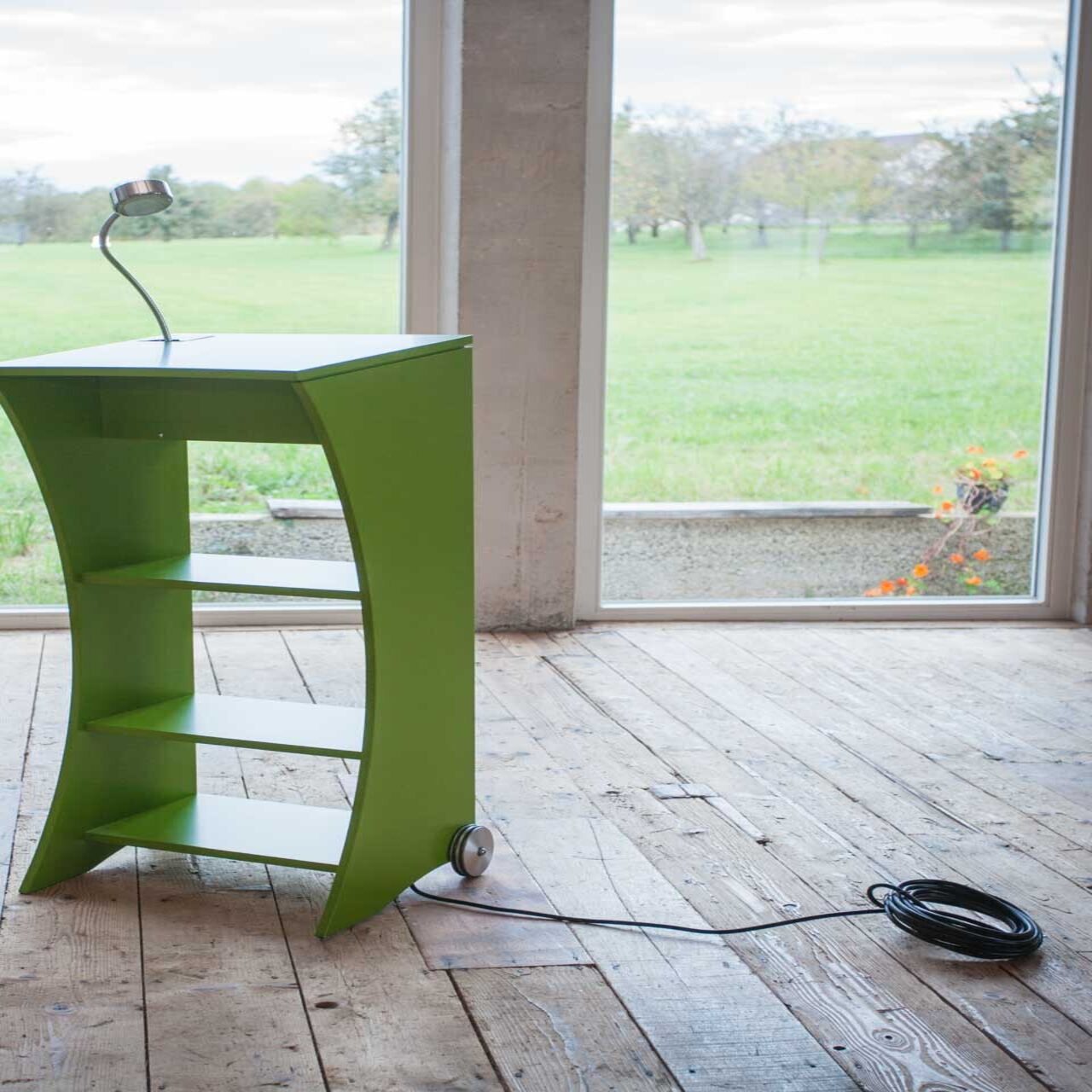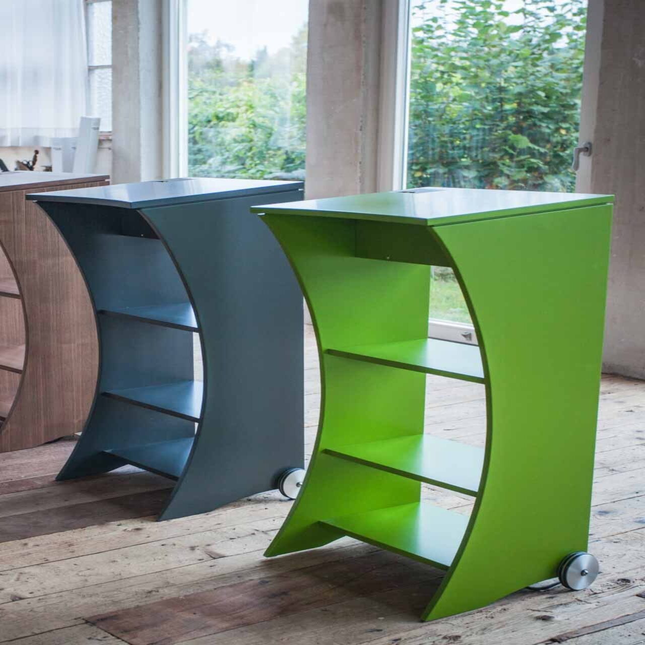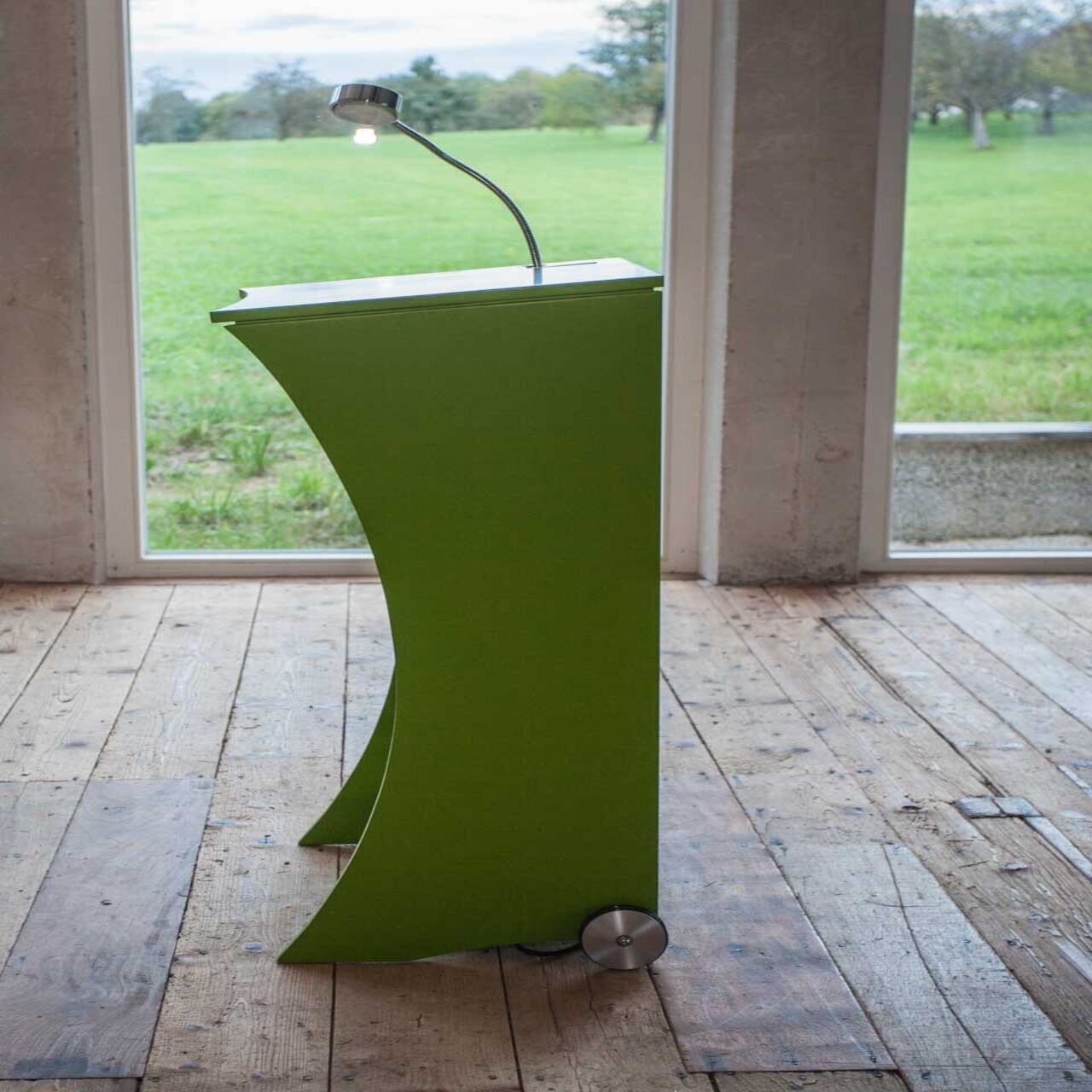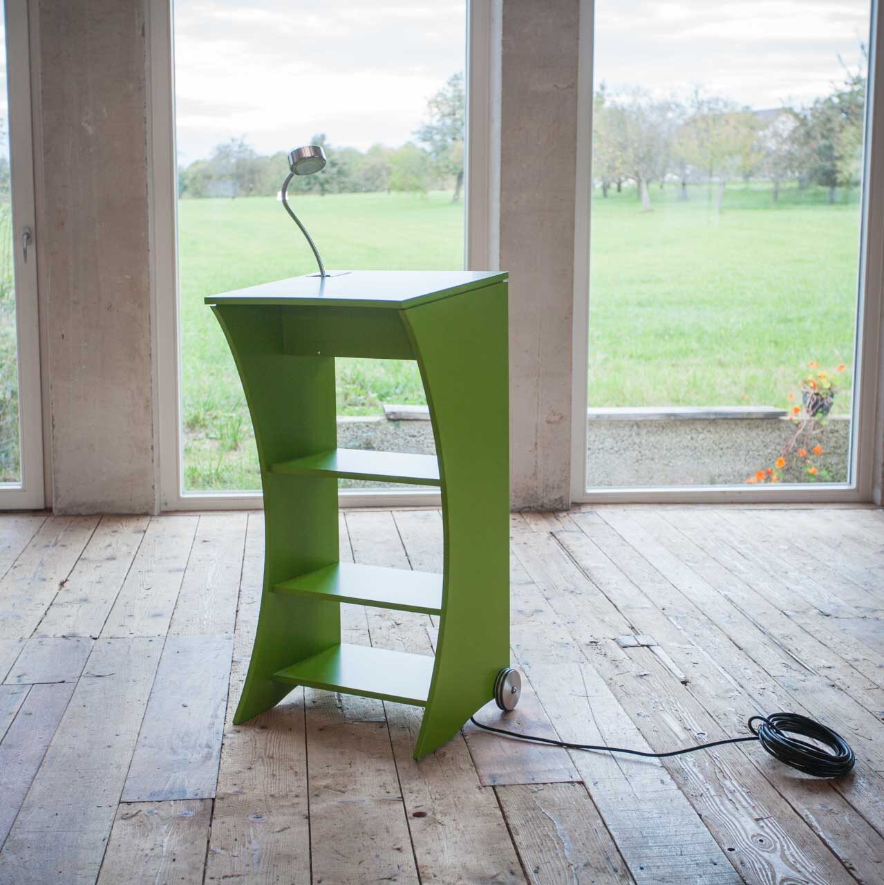 Stehpult mit Rädern aus massiven Aluminium, Ablagefächer für Laptop und Bücher. Arbeitsfläche oben zum Bediener Leicht geneigt. Oben zwei 230V-Steckdosen für die Leselampe und Ladegerät. Einspeisung über Kabel mit scharzem Stecker. Oberfläche Holz natur oder farbig lackiert.