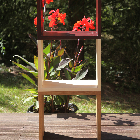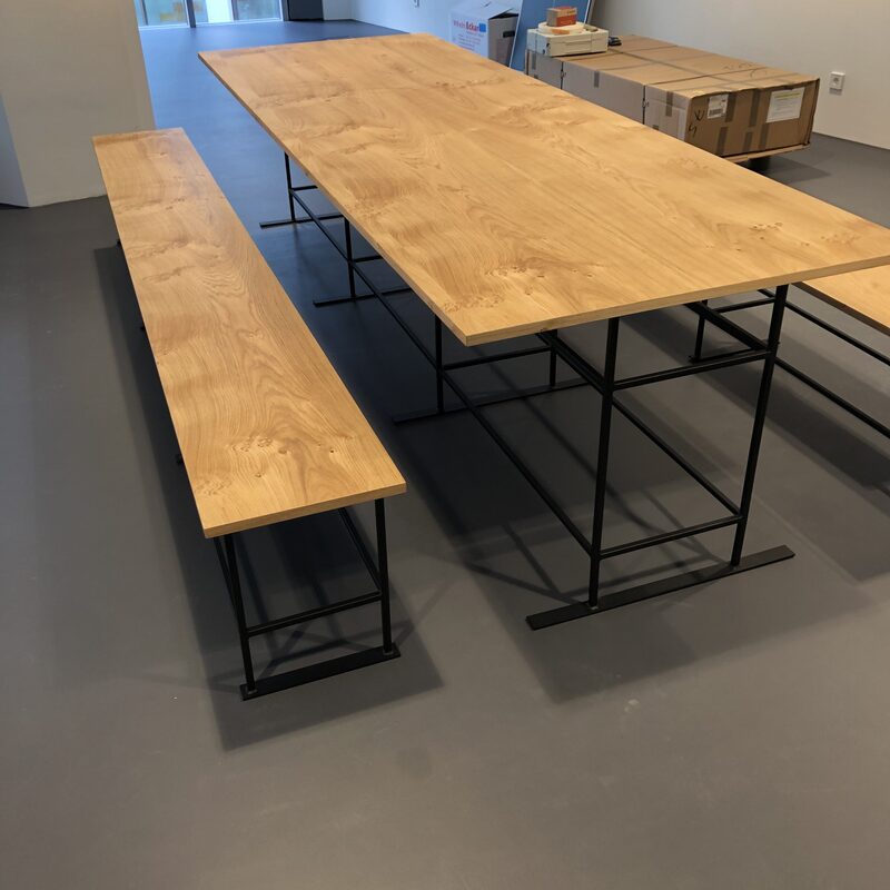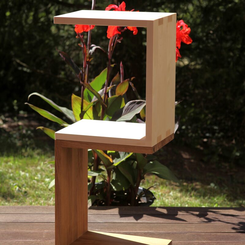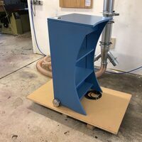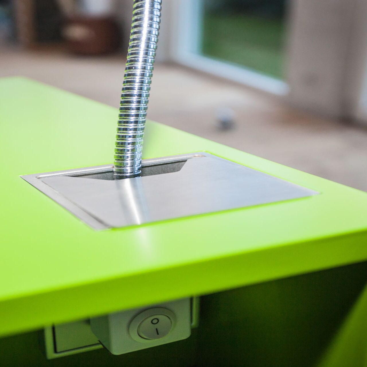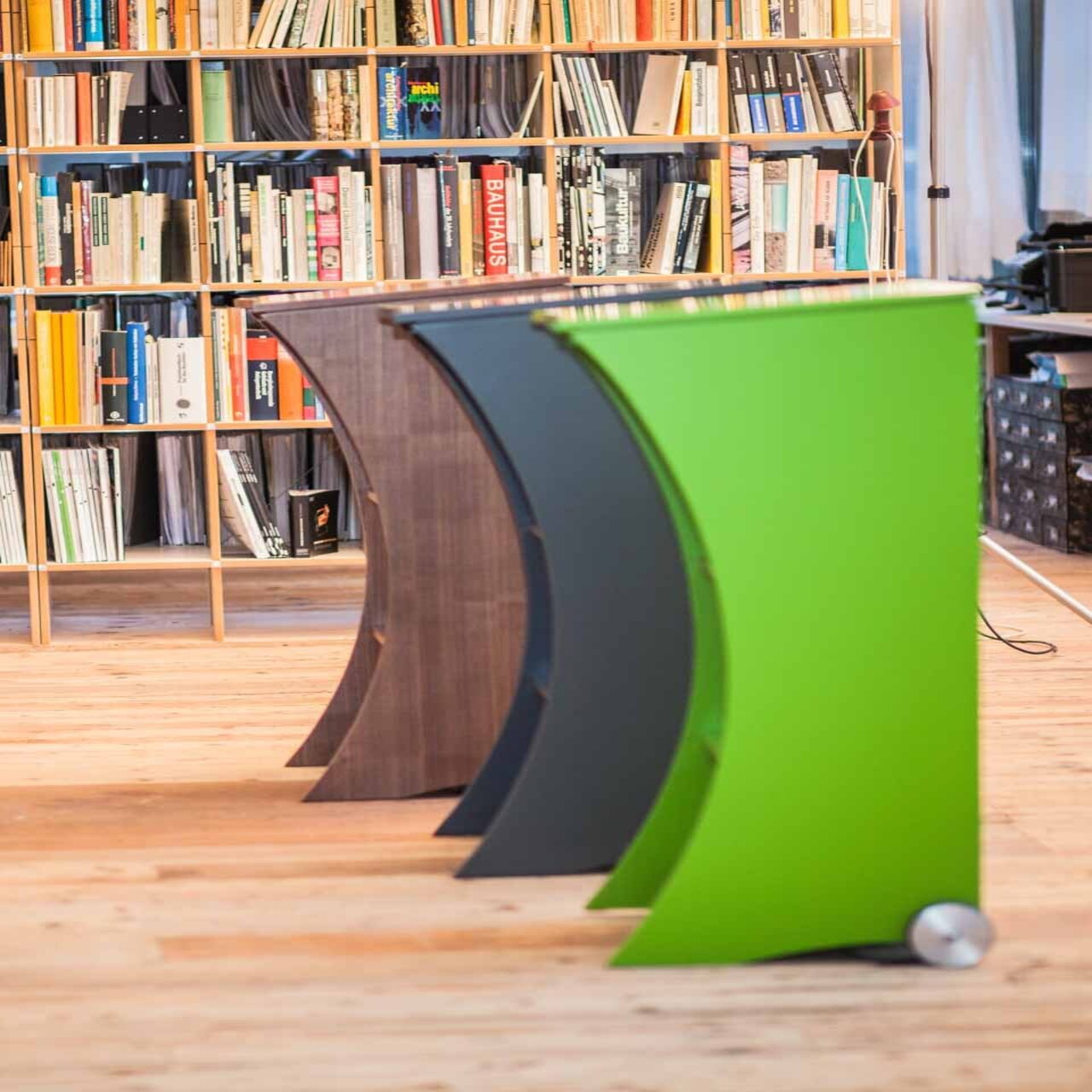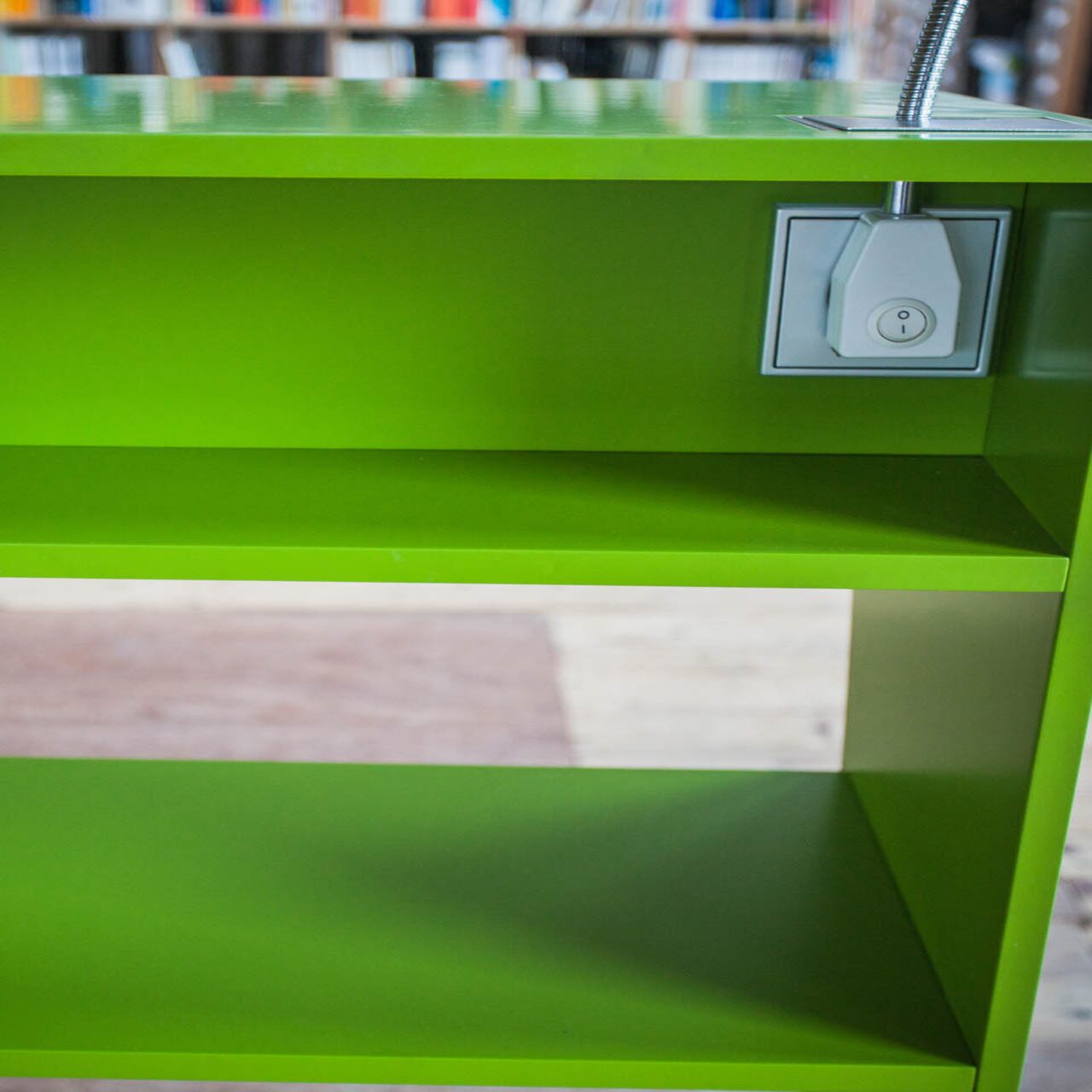 Stehpult mit Rädern aus massiven Aluminium, Ablagefächer für Laptop und Bücher. Arbeitsfläche oben zum Bediener Leicht geneigt. Oben zwei 230V-Steckdosen für die Leselampe und Ladegerät. Einspeisung über Kabel mit scharzem Stecker. Oberfläche Holz natur oder farbig lackiert.